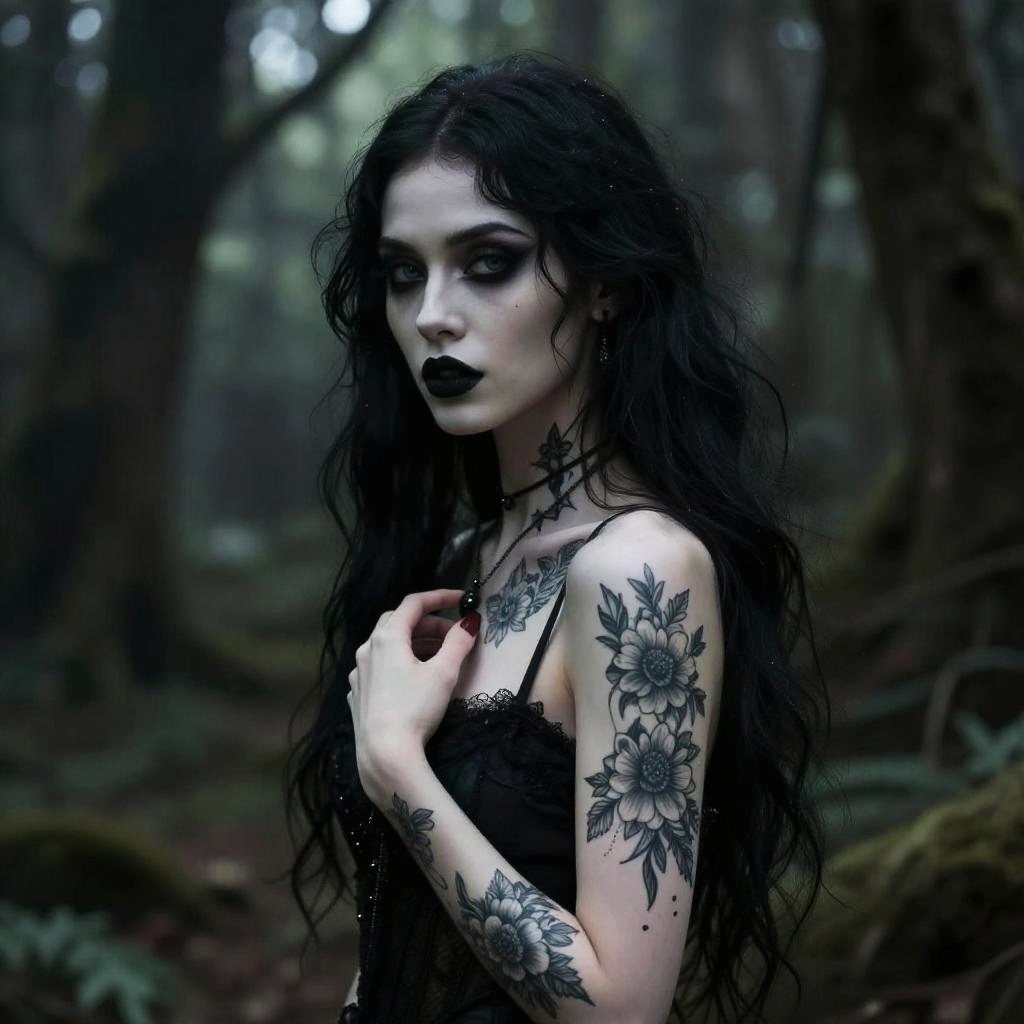 Tom Bagshaw art inspired scene featuring a gothic female character with ethereal beauty, dark mood, floral tattoos, and a mystical forest background, high contrast and refined textures