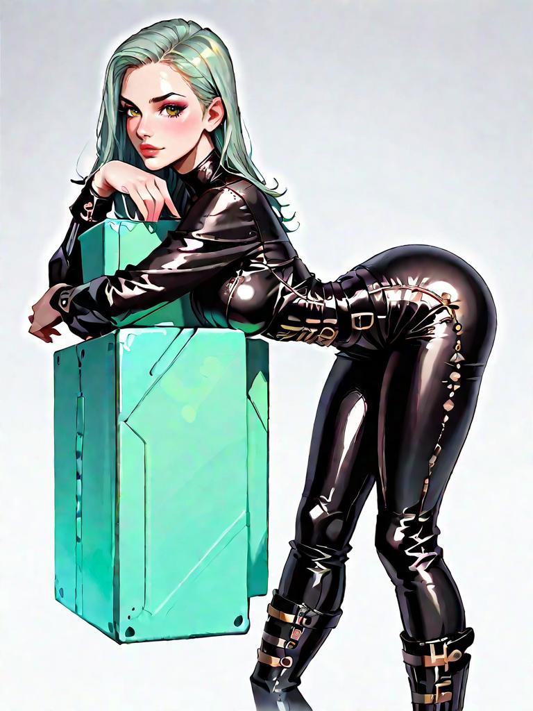 1girl, realistic face, Latex bodycon dress, emerald green, long sleeves, deep V-neck, figure-hugging silhouette, glossy sheen, Leather belt, wide, black, silver buckle, cinched waist, accentuating curves, Leather ankle boots, matching green, stiletto heel, sleek design, minimalist style