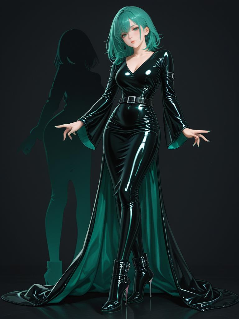 Realistic anime-style woman with emerald green hair wearing a glossy, figure-hugging latex bodycon dress with long sleeves and a deep V-neck. The outfit features a wide black leather belt with a silver buckle, accentuating her cinched waist, and matching leather ankle boots with stiletto heels. The dress has a sleek, minimalist design with a flowing train, set against a dark background with her shadow visible.