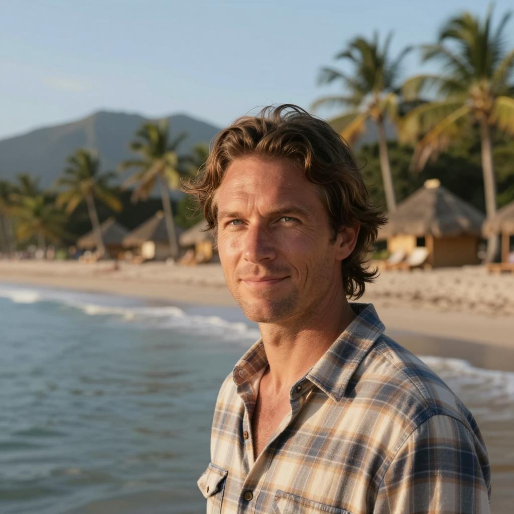 Man with light brown hair, wearing a blue denim jacket and matching pants, carrying a backpack, walking near a muddy river. Green leaves in the top left corner, a small bush on the right. Side profile, slight smile, right hand on hip.