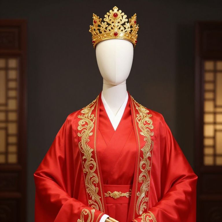 Photograph of a faceless, white mannequin wearing a rich red, ornate robe with intricate, golden embroidery along the edges and chest area. The robe has a high collar and a gold belt at the waist. The mannequin also wears a detailed, gold crown adorned with red jewels. The background is a plain, light grey, highlighting the vibrant colors and textures of the robe and crown. The image focuses on the upper torso and head of the mannequin, emphasizing the royal and regal appearance.