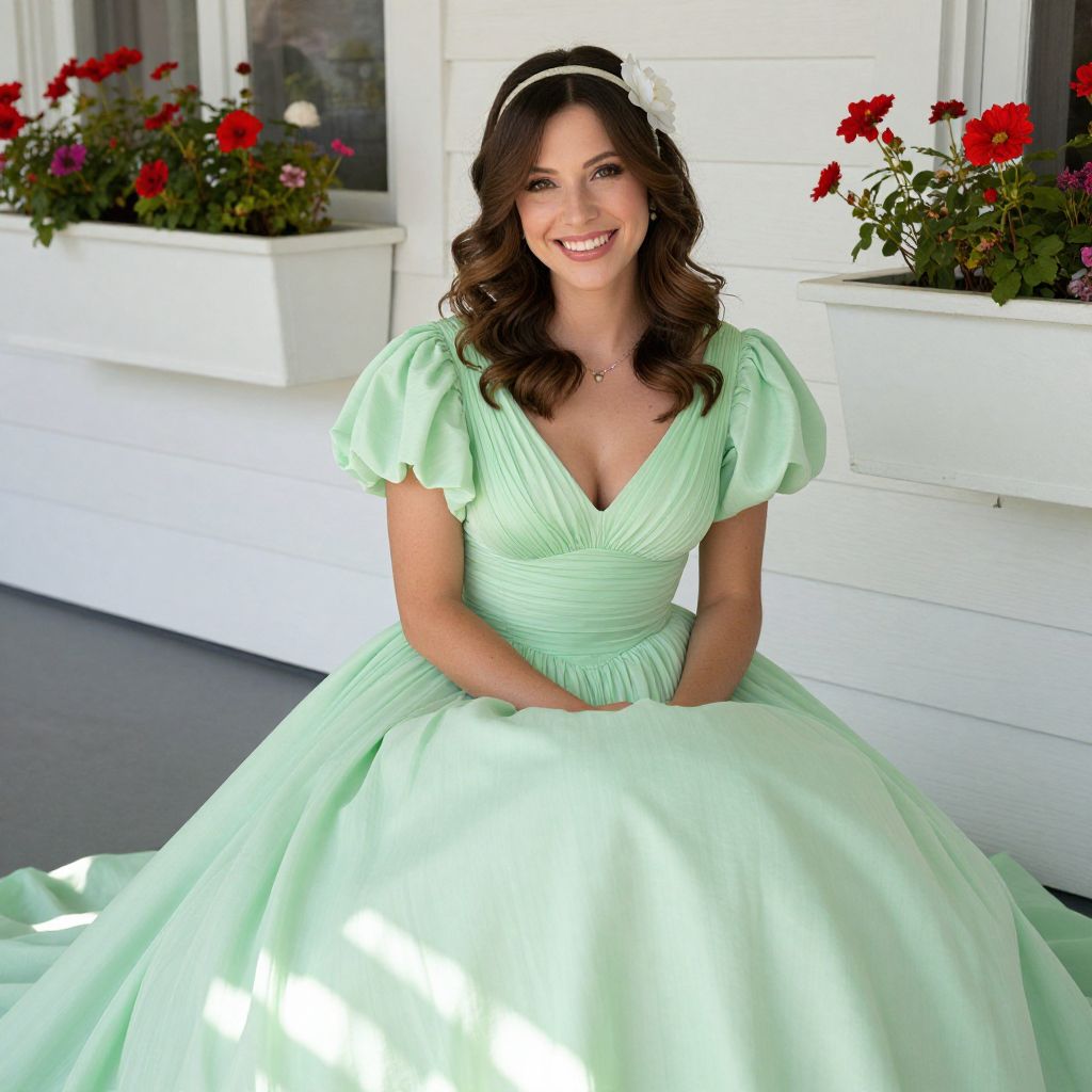 Photograph of a smiling woman with wavy brown hair, wearing a mint green, V-neck ball gown with puffed sleeves, sitting outdoors by white