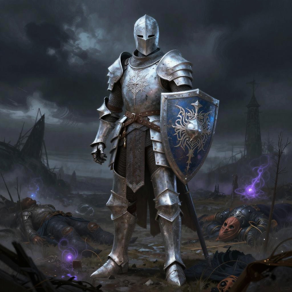 Digital artwork of a silver-armored knight with a helmet, holding a shield with a dragon emblem, standing in a dark, stormy battlefield with scattered