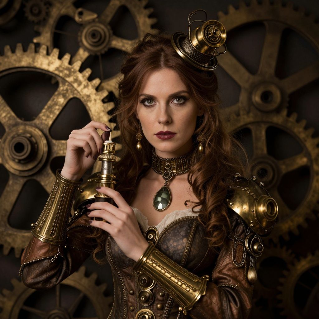Enveloped in the embrace of steampunk elegance, a woman stands as a guardian of time, her gaze piercing through the gears of eternity, while the faint hum of cogs and the scent of polished brass whisper tales of adventure and untold destinies.