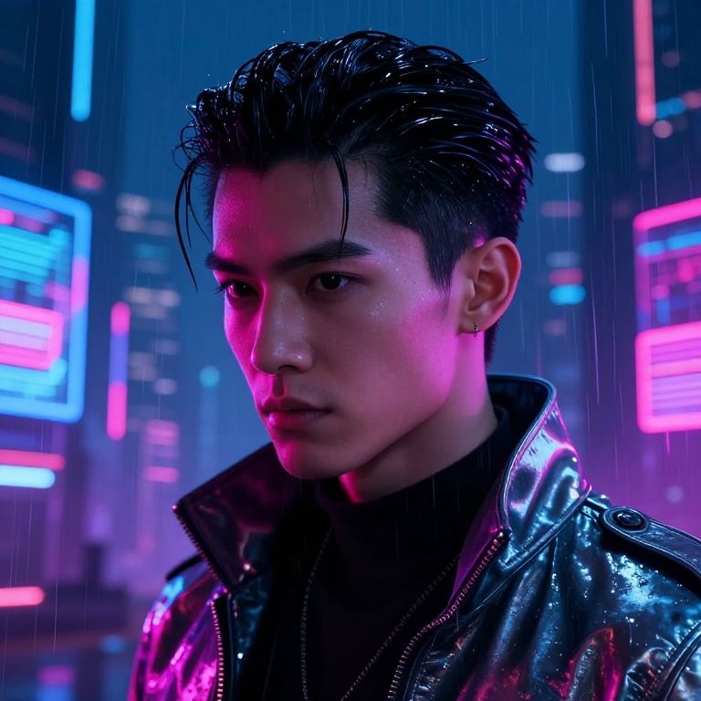 Slick back black hair male in a futuristic cyberpunk setting, neon lights reflecting on his hair and face, wearing a metallic jacket, vibrant city backdrop with holograms and rain, ultra-detailed, sci-fi atmosphere with depth