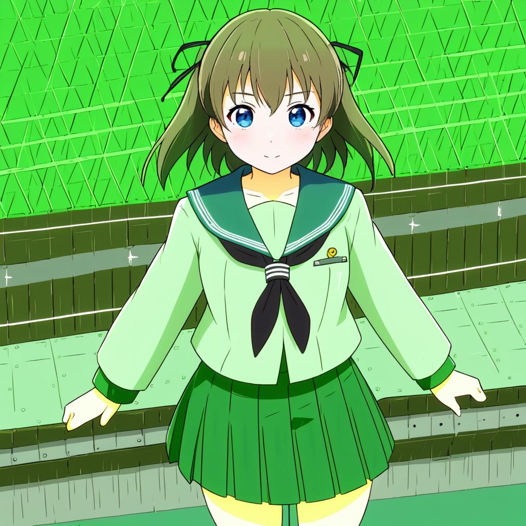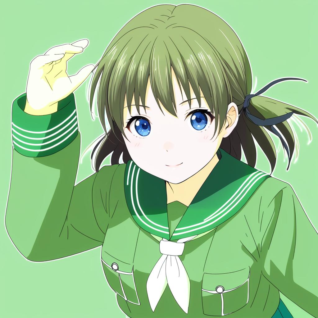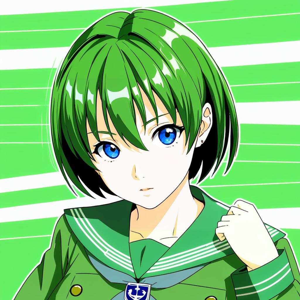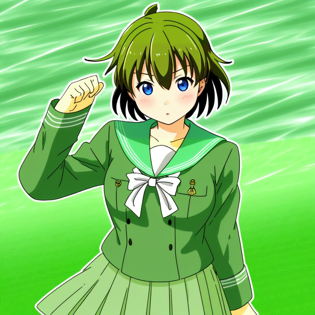 Illustration of an anime-style girl with short green and black hair, striking blue eyes, and a light complexion. She wears a green schoolgirl sailor uniform (serafuku) consisting of a jacket with a white bow, long sleeves, and a pleated skirt. The character is depicted with a determined expression and a raised fist, set against a vibrant green abstract background.