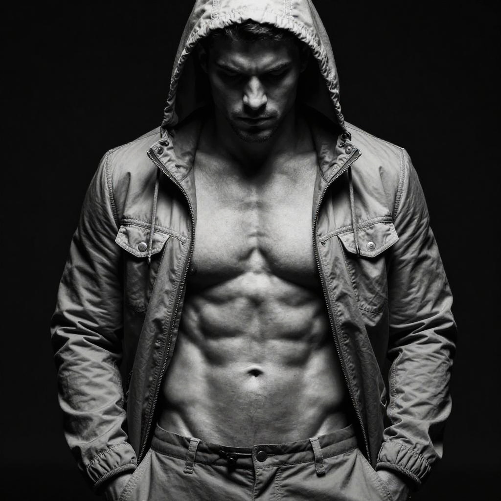 A high-contrast black and white photograph of a muscular man with a serious expression. He's wearing a hooded jacket, unzipped to reveal his well-defined, sculpted abs and chest. His hands are in his pockets, and the hood casts shadows over his face. The background is completely black, making the subject stand out sharply. The overall vibe is intense and gritty.