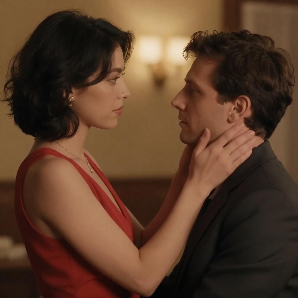 Photograph of a romantic scene with a man and woman in close embrace. Man in blue long-sleeve shirt, woman in red spaghetti-strap dress. Man has short brown hair, woman has short brown hair. Intense eye contact, man's hand on woman's waist. Background has soft, warm lighting.