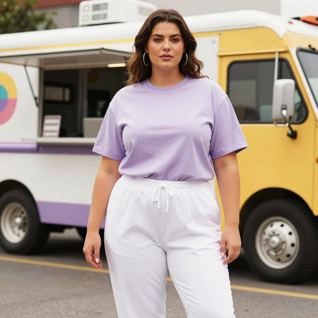 A lanky woman in a casual sporty outfit, oversized lilac T-shirt and white jogger pants, stands in a vibrant Food Truck Rally in the Art District, captured in the visual style of Mappa Studio. Sexy. Pretty face and beutiful eyes