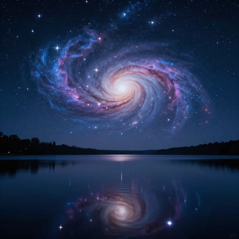 Photograph of a nighttime scene featuring a vibrant, glowing spiral galaxy with swirling blue, purple, and pink hues, set against a star-studded dark blue sky. The galaxy's bright core shines brightly, reflected perfectly in a calm, mirror-like lake below. Silhouetted tree line stretches across the horizon, dividing the sky and water. The image captures the serene beauty of the cosmic phenomenon and its reflection, creating a symmetrical and tranquil visual.