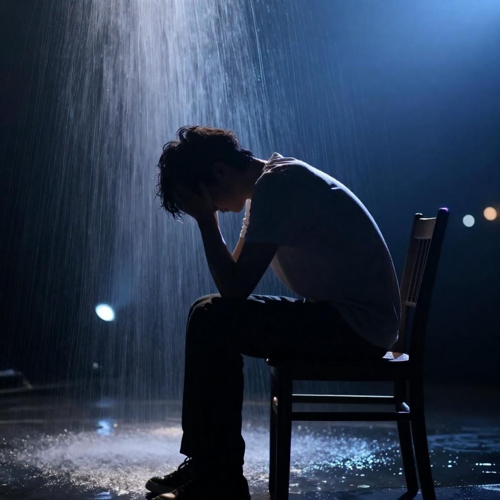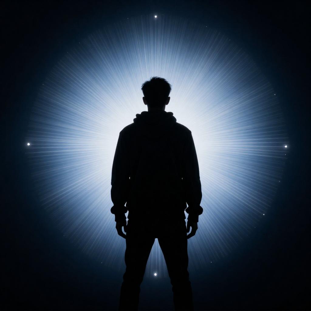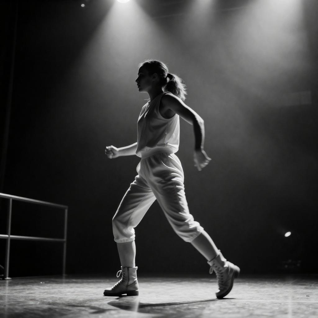 Black and white photograph of a silhouetted figure in a dynamic pose, arms raised, surrounded by abstract, splattered light and dark patterns. The figure's outline is stark white against a predominantly black background, creating a high-contrast, dramatic effect. The image has a gritty, ured appearance.