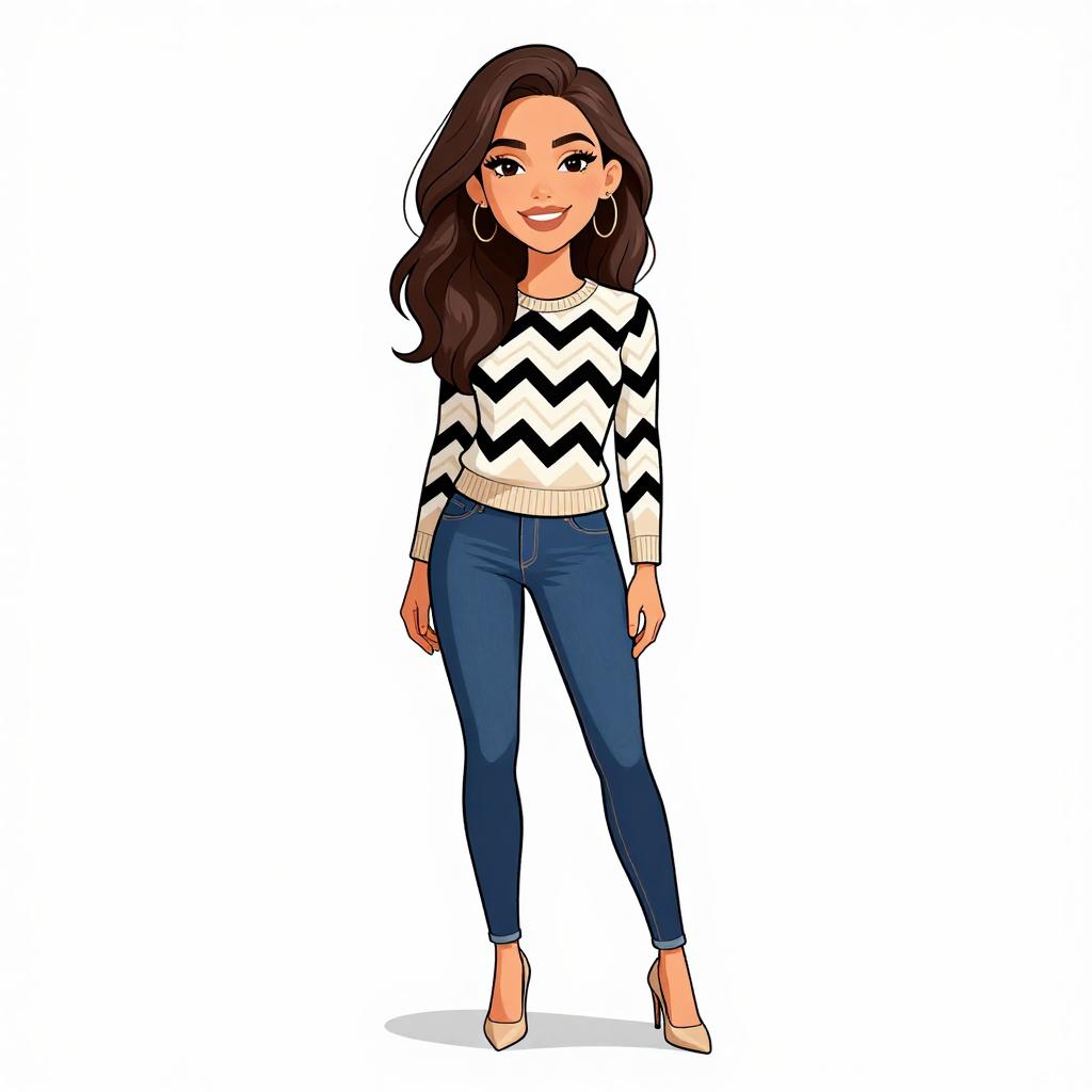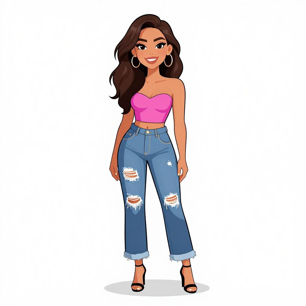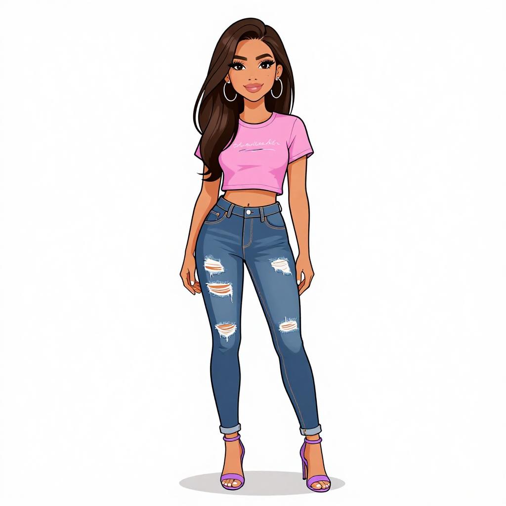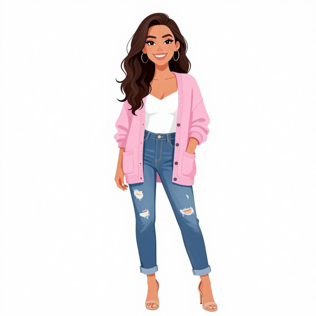 Woman with pretty face and pretty hair. smiling Woman, casual chic, lilac ribbed knit sweater with raw hem and distressing at the waist, round neckline, long balloon sleeves with fitted cuffs, light-wash ripped jeans with distressed knees and a cropped fit, metallic purple high-heel sandals with ankle straps, white studio background. --sref 1467
