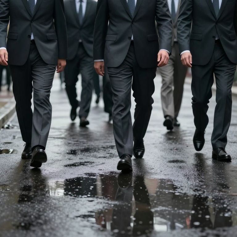 In a surreal procession of suits and muted tones, figures march forward into an uncertain future, their reflections mirrored in the wet pavement below—a poignant reminder of the unyielding path ahead and the echoes of steps taken, yet to be retraced.