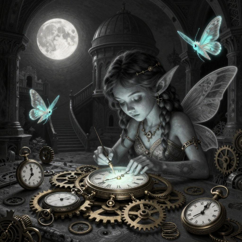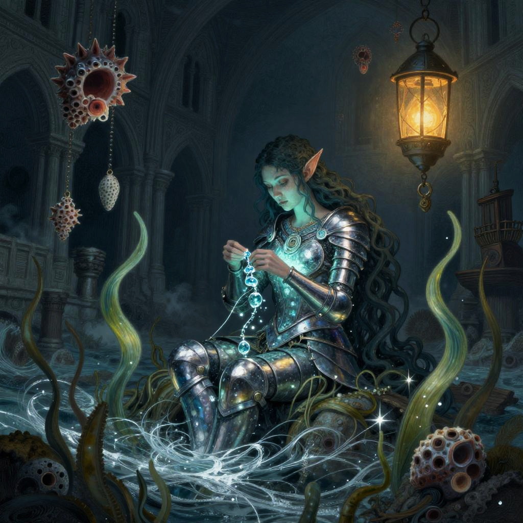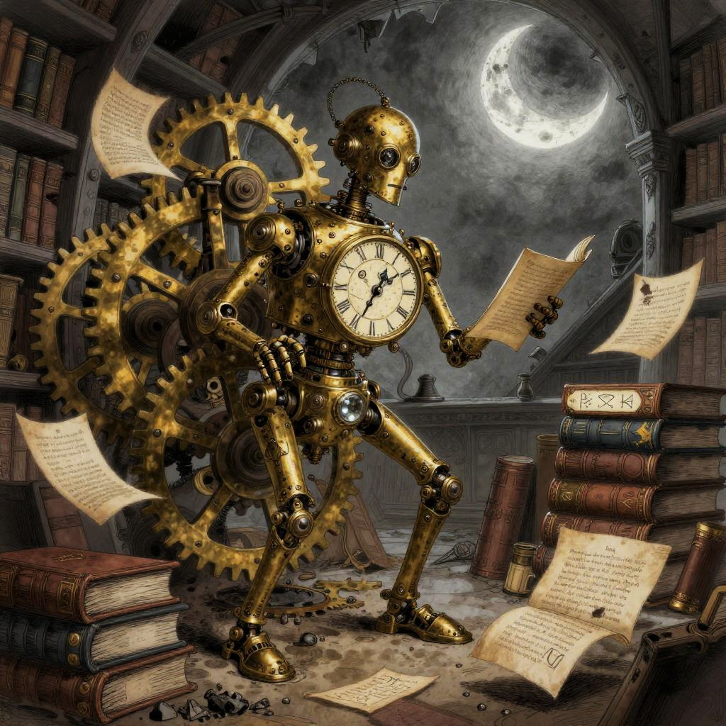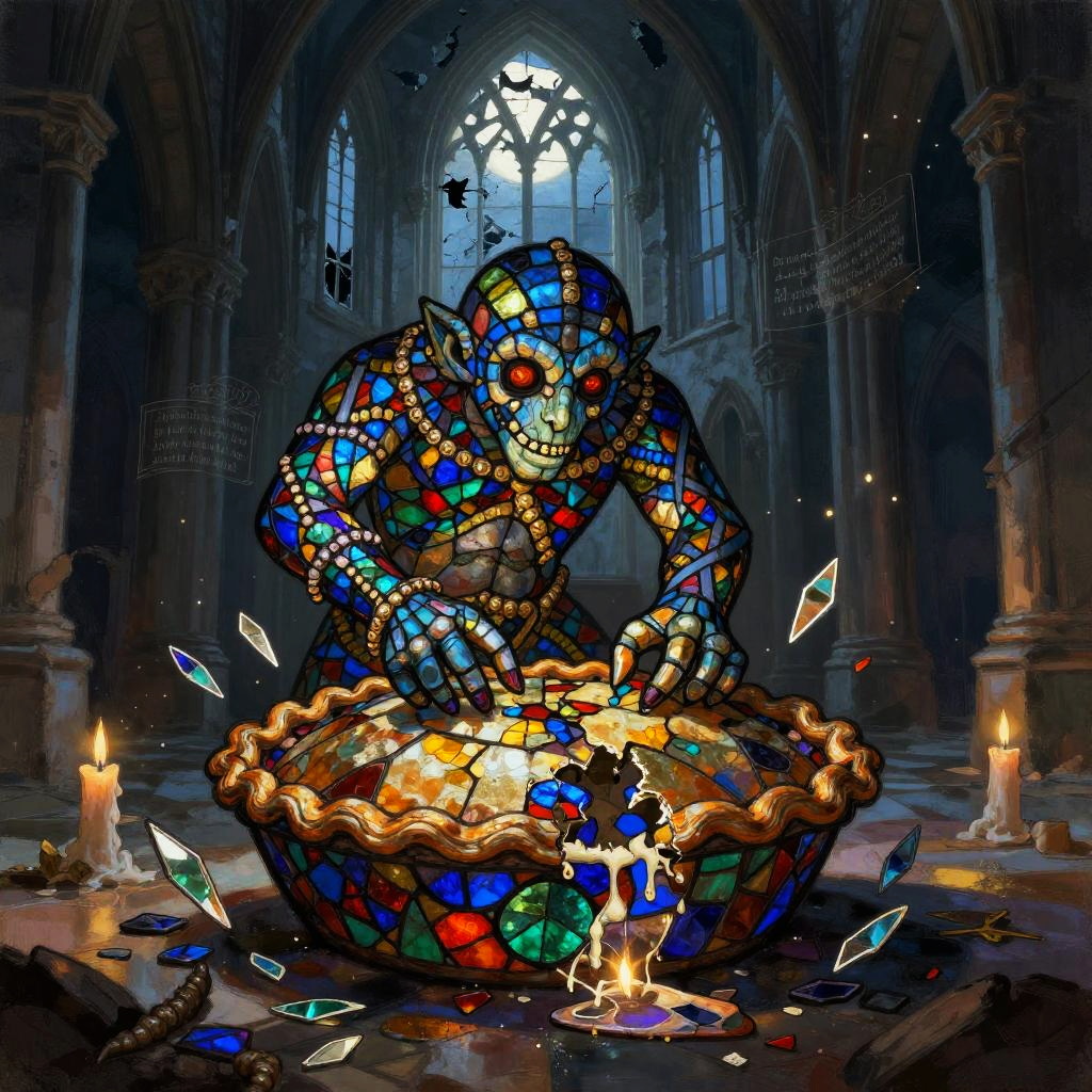 A fantasy illustration of a stained-glass golem piecing itself together, surrounded by shards of colored glass, glinting lead filigree, drifting motes of light, melted candle drips, and faint echoing hymns, in the dim nave of a ruined cathedral at twilight with moonlight through broken windows, created in luminous stained-glass realism with painterly, shadowed atmosphere, dark and atmospheric