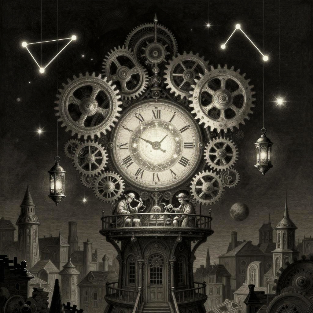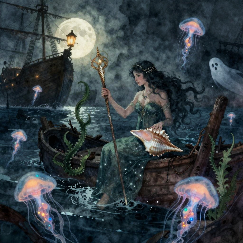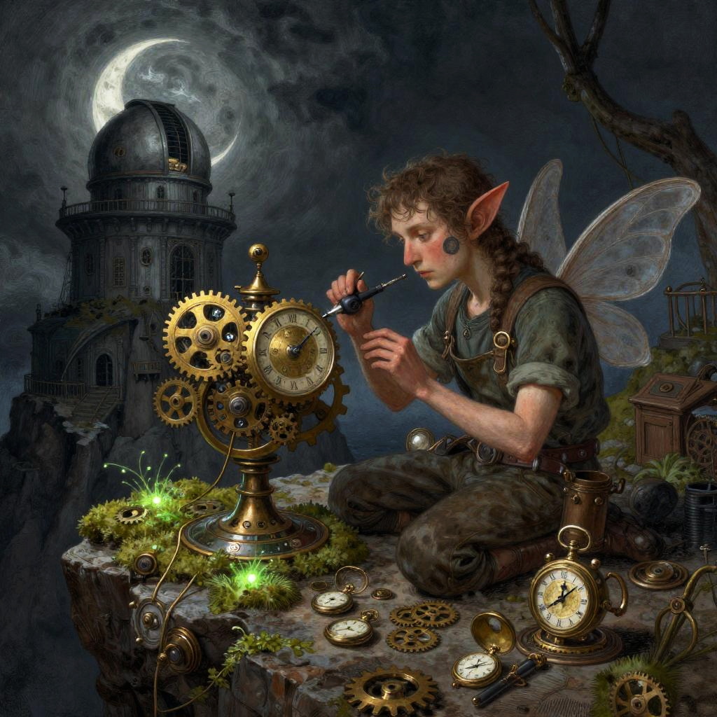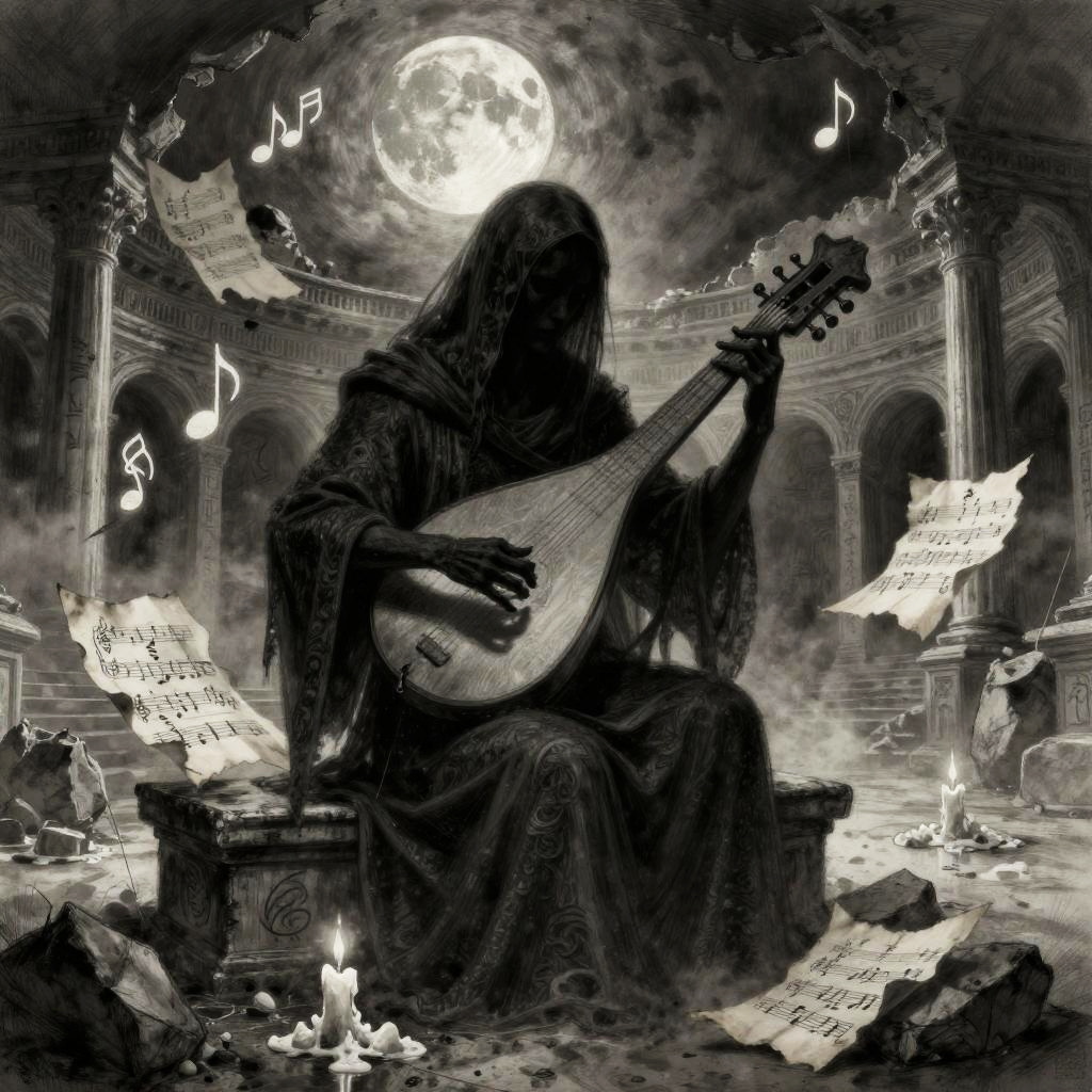 A fantasy illustration of a stained-glass golem piecing itself together, surrounded by shards of colored glass, glinting lead filigree, drifting motes of light, melted candle drips, and faint echoing hymns, in the dim nave of a ruined cathedral at twilight with moonlight through broken windows, created in luminous stained-glass realism with painterly, shadowed atmosphere, dark and atmospheric