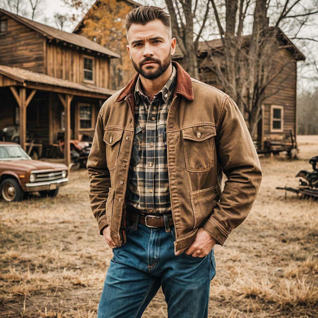 Photo of a Rugged Build man, High Fade, country outfit, vintage mechanics jacket with a checkered shirt and traditional western boots, soft earth tones