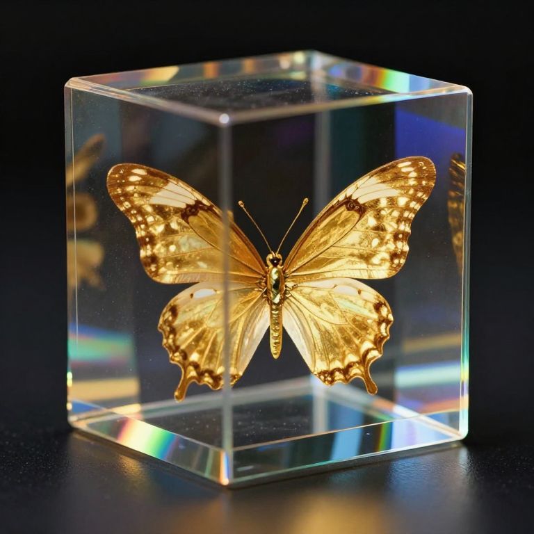 The image features a striking glass cube with a holographic representation of a golden butterfly inside. The cube, with its transparent and reflective surface, captures the light in a way that highlights its geometric form. The butterfly, with its intricate golden wings and delicate structure, appears to be suspended within the cube, creating a sense of depth and dimension. The holographic effect gives the butterfly a three-dimensional appearance, making it seem as though it is floating within the confines of the glass. The interplay of light and shadow on the cube's surface enhances the overall visual impact, while the dark background further accentuates the vibrant colors and detailed textures of both the cube and the butterfly. The composition is balanced, with the butterfly positioned centrally within the cube, drawing the viewer's eye to the heart of the image.