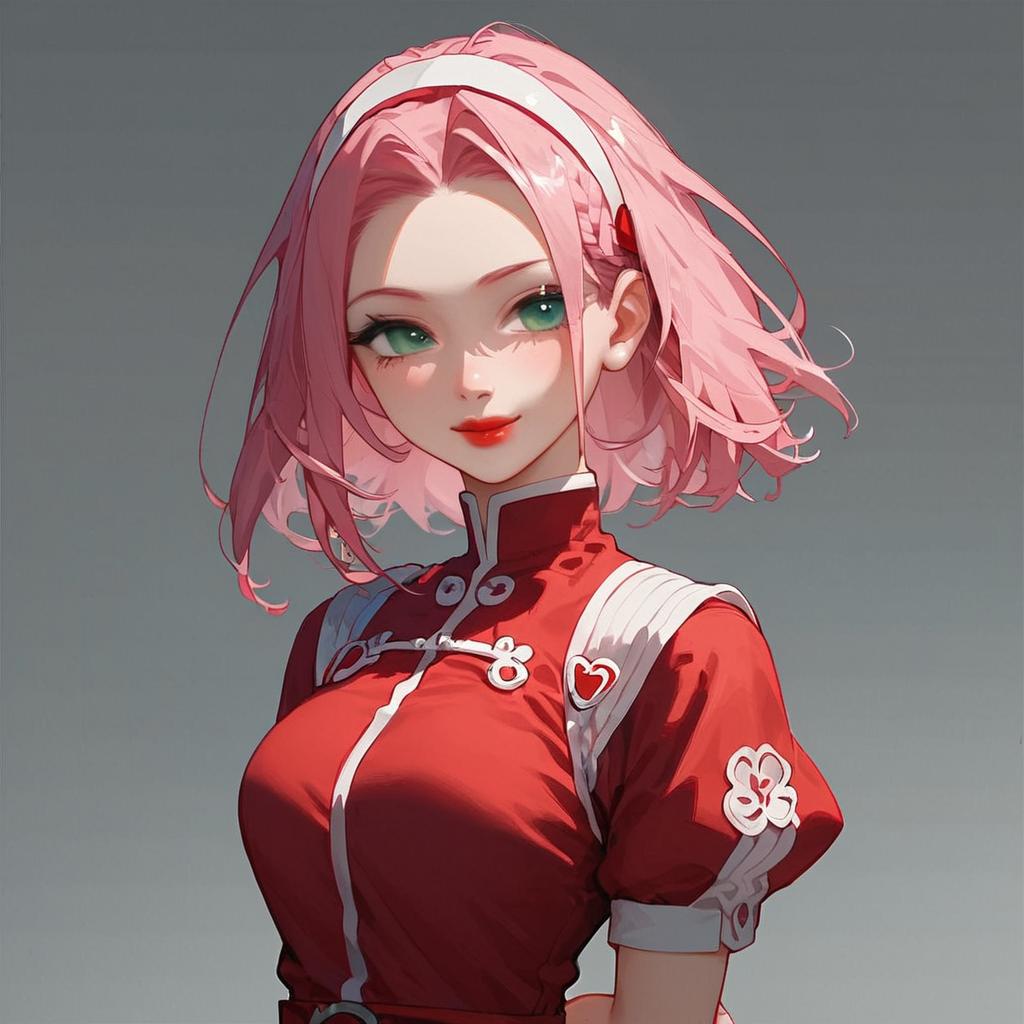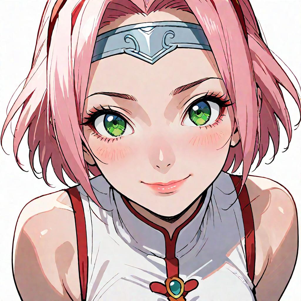 Score_9, score_8_up, score_7_up, score_6_up, score_5_up, score_4_up, , source_anime, 1girl, haruno sakura, pink hair, short hair, green eyes, sleeveless, red shirt, forehead protector, hands behind back, smile, upper body, looking at viewer, solo, simple background, white background, anime screencap