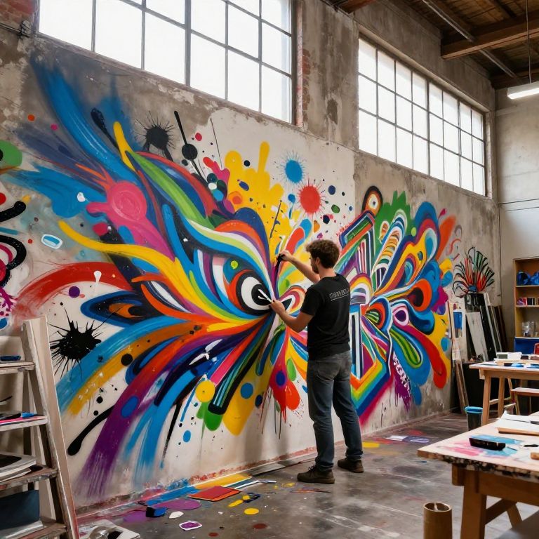 Photograph of a male artist in a black shirt, painting vibrant, abstract graffiti on a concrete wall in a sunlit warehouse studio.