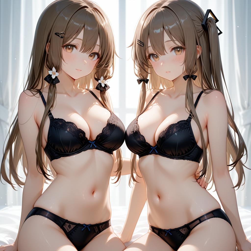 K2 (girls' frontline), girls' frontline, 1girl, brown eyes, hair between eyes, brown hair, long hair, sidelocks, hairclip, medium breasts, large breasts, cleavage, navel, collarbone, black panties, bare shoulders, one side up, by artist taiki (6240taiki), dark_illustrious