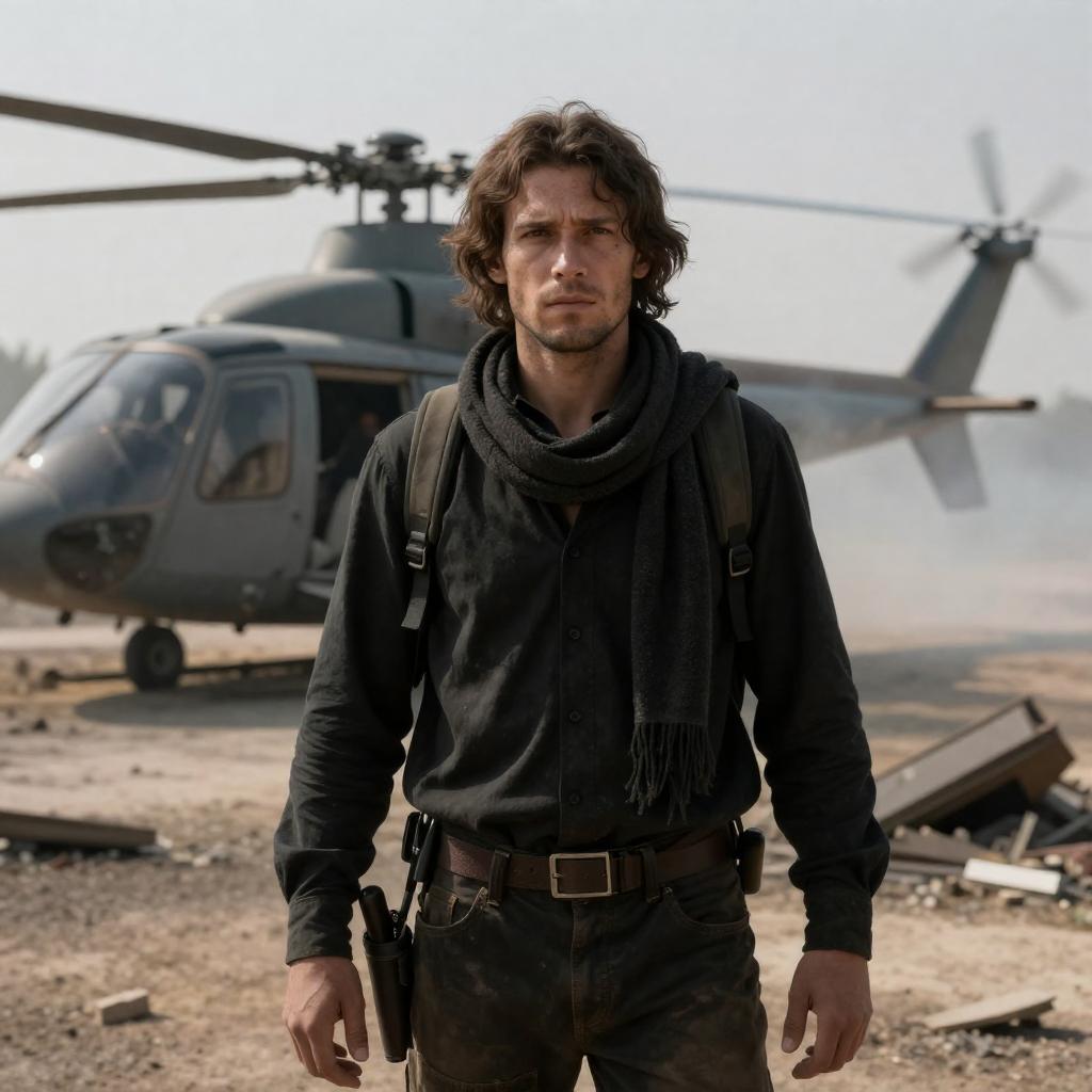 A rugged man with medium-length blonde hair, wearing a black shirt and gray scarf, stands in a war-torn city. Two helicopters fly overhead. Debris and destroyed buildings surround him. Intense facial expression. Multiple people in background.