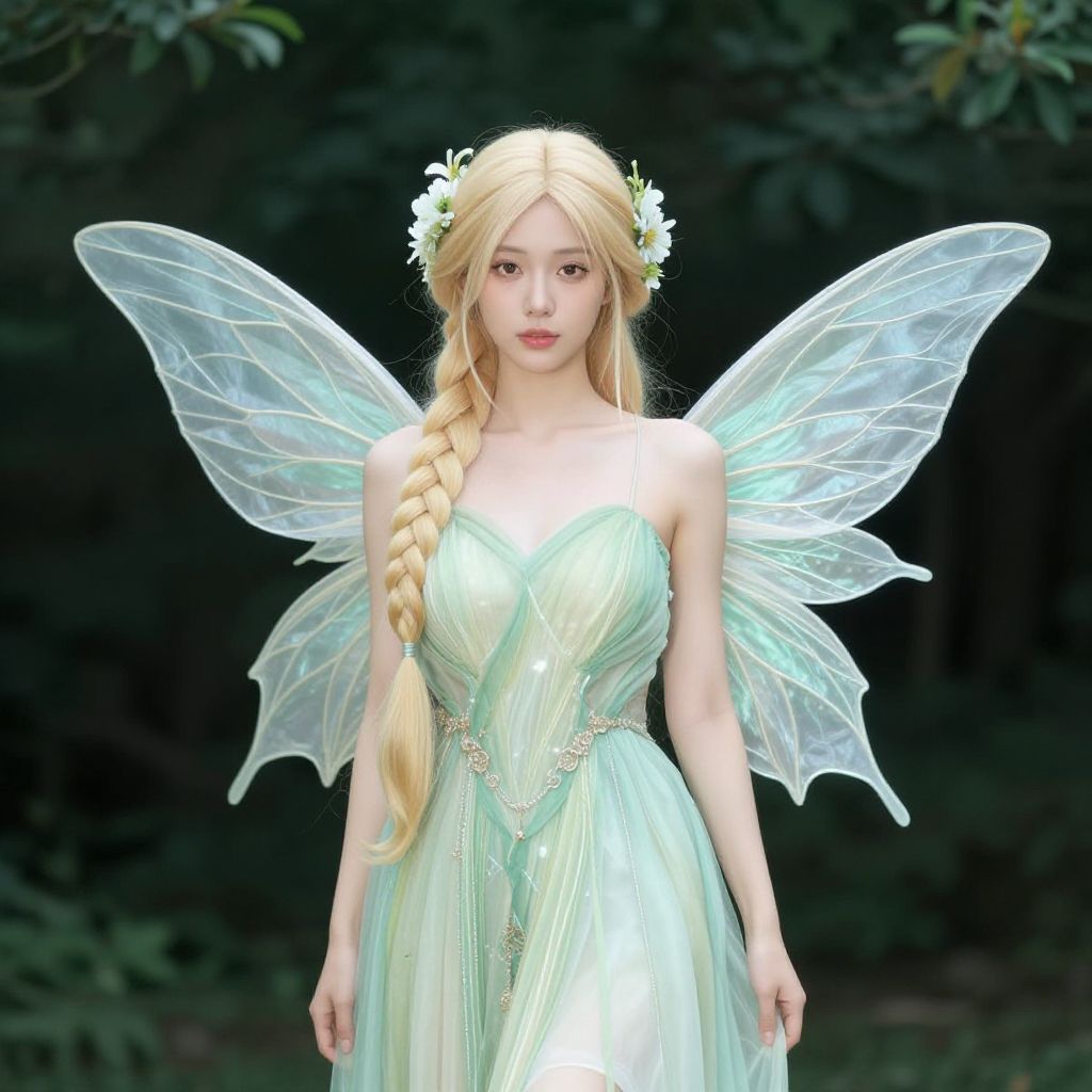 A digital artwork depicting a fair-skinned, blonde-haired fairy woman with delicate, translucent wings. She wears a shimmering, light green, strapless dress with a subtle, pleated texture. Her long, braided hair is adorned with white flowers. She stands against a dark, forested background, which contrasts with her ethereal appearance. Her eyes are large and expressive, and her wings are semi-transparent with intricate vein patterns. The overall style is fantasy, with a soft, glowing aesthetic. The image has a realistic yet magical quality, emphasizing her fairy-like nature.