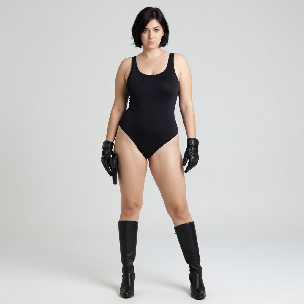 Photograph of a confident Asian woman with short black hair, wearing a black tank leotard, gloves, and knee-high boots, standing against a