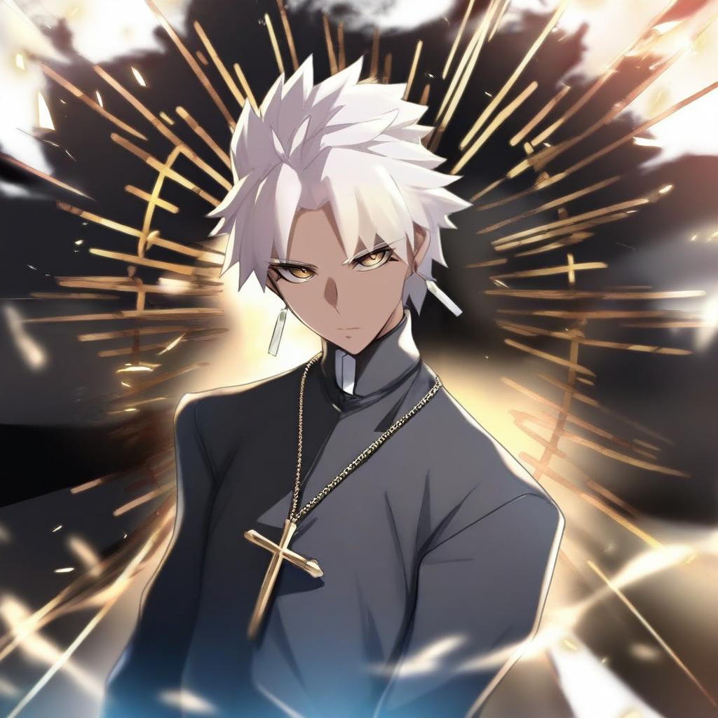Digital illustration of Amakusa Shirou, a dark-skinned male anime character with white short hair and yellow-brown eyes. He is depicted wearing a dark priest outfit with long sleeves, a cross necklace, and earrings. The background features dramatic lighting with golden streaks, enhancing the intense and mystical atmosphere.