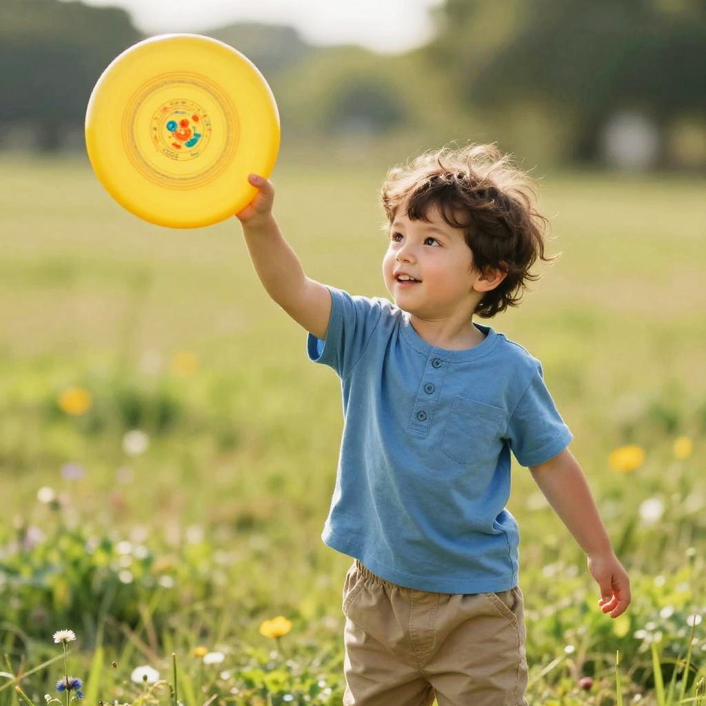 Photograph of a young boy with curly brown hair, wearing a blue shirt and beige pants, throwing a bright yellow frisbee in a sunlit