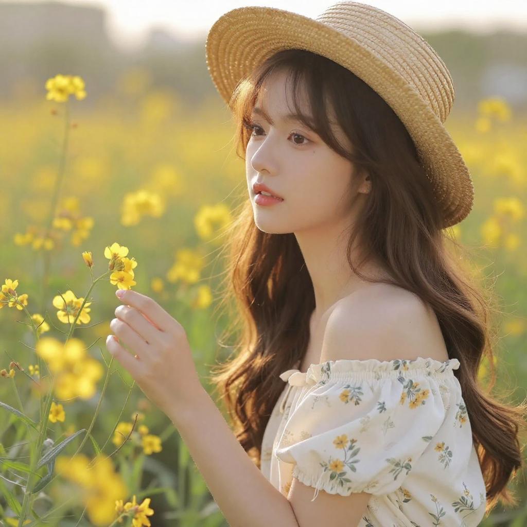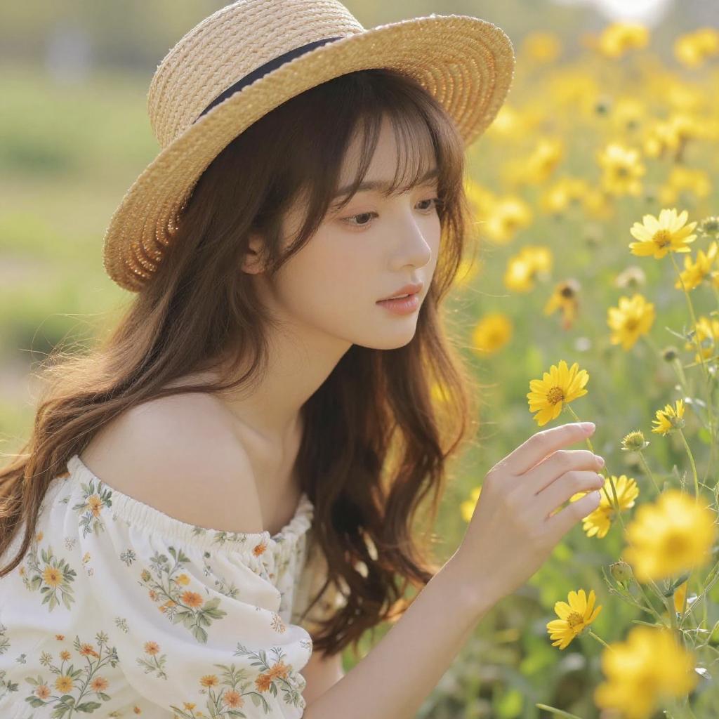 Photograph of an East Asian woman with long, wavy brown hair and fair skin, wearing a straw hat with a black ribbon and an off-shoulder white blouse with a floral pattern. She is gently touching a bright yellow daisy in a sunlit field of similar flowers, looking to the right with a serene expression. The background is a soft blur of green and yellow, highlighting the vibrant flowers. The sunlight casts a warm, golden glow over the scene, enhancing the natural beauty and tranquility of the moment.