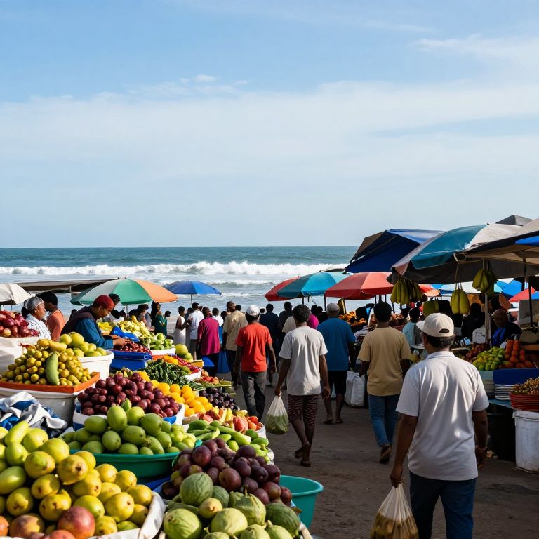 Vibrant beach market scene photograph: colorful umbrellas, diverse crowd, baskets of fruits, ocean waves in background, sunny day, bustling atmosphere.