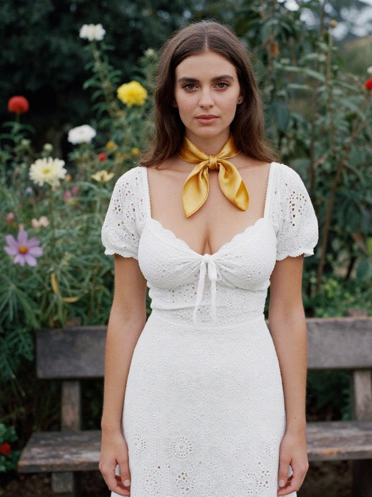 A Slim woman, in a white eyelet dress with floral cut-outs and short puff sleeves, paired with a mustard yellow silk scarf, captured in the visual style of 3M analog film stock, standing in a flower garden near a rustic bench. Sexy. Pretty face and beаutiful eyes. Big breasts