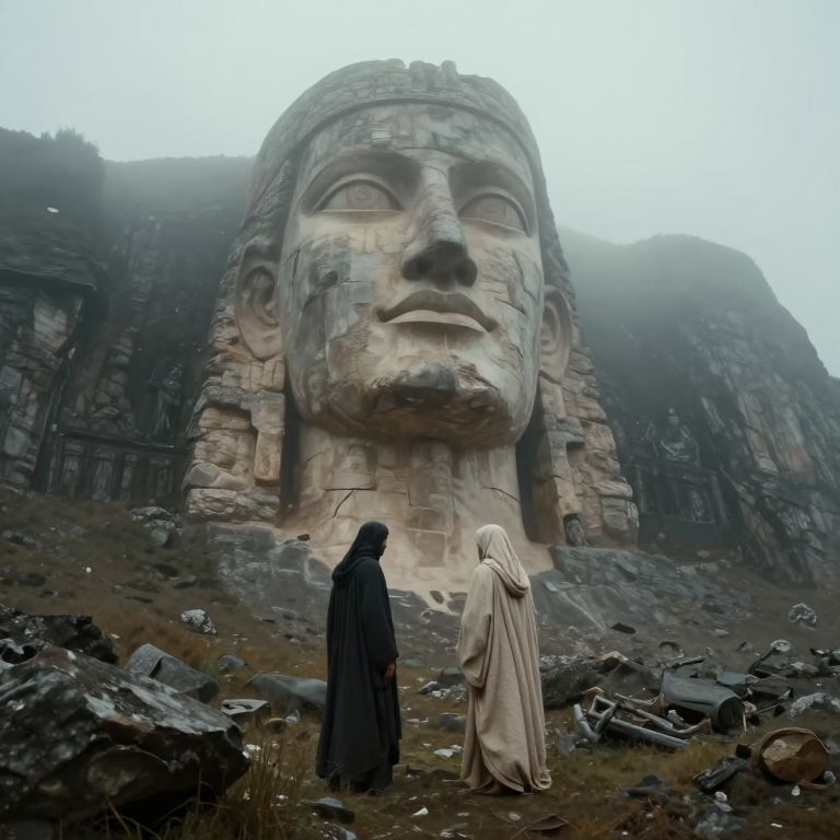 Amidst the misty embrace of eternity, two figures stand humbled before a colossal visage carved into the mountain, their presence a testament to the enduring dialogue between humanity and the timeless whispers of the earth.