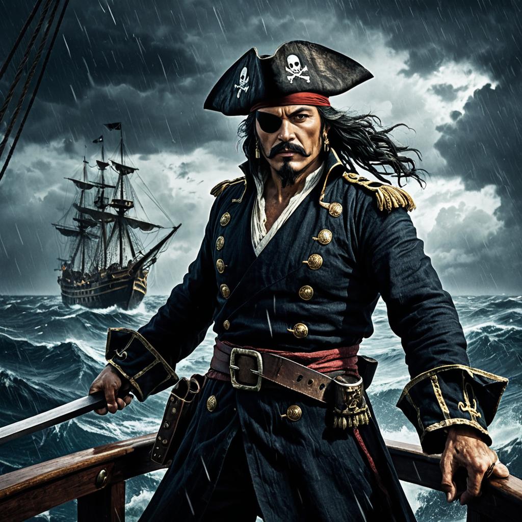 Dramatic anime-style illustration of a fierce pirate captain with a weathered face and distinctive eye patch. He is dressed in a detailed black naval coat with gold buttons and epaulettes, a red sash, and a black tricorn hat featuring skull and crossbones. The captain grips a sword firmly while standing on the deck during a stormy sea battle. Behind him, a large pirate ship sails through rough, rain-soaked ocean waves under dark, tumultuous clouds.