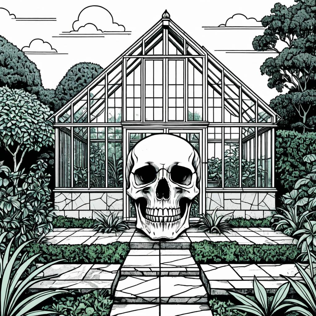 Skull as a coloring book illustration of a desert adobe house built on a dry sandstone mesa. Rendered in 1-bit line art style by Clara Miller Burd, featuring thin black lines, crisp thick outlines, and a design that uses the entire screen for a high-detail adult coloring book page.