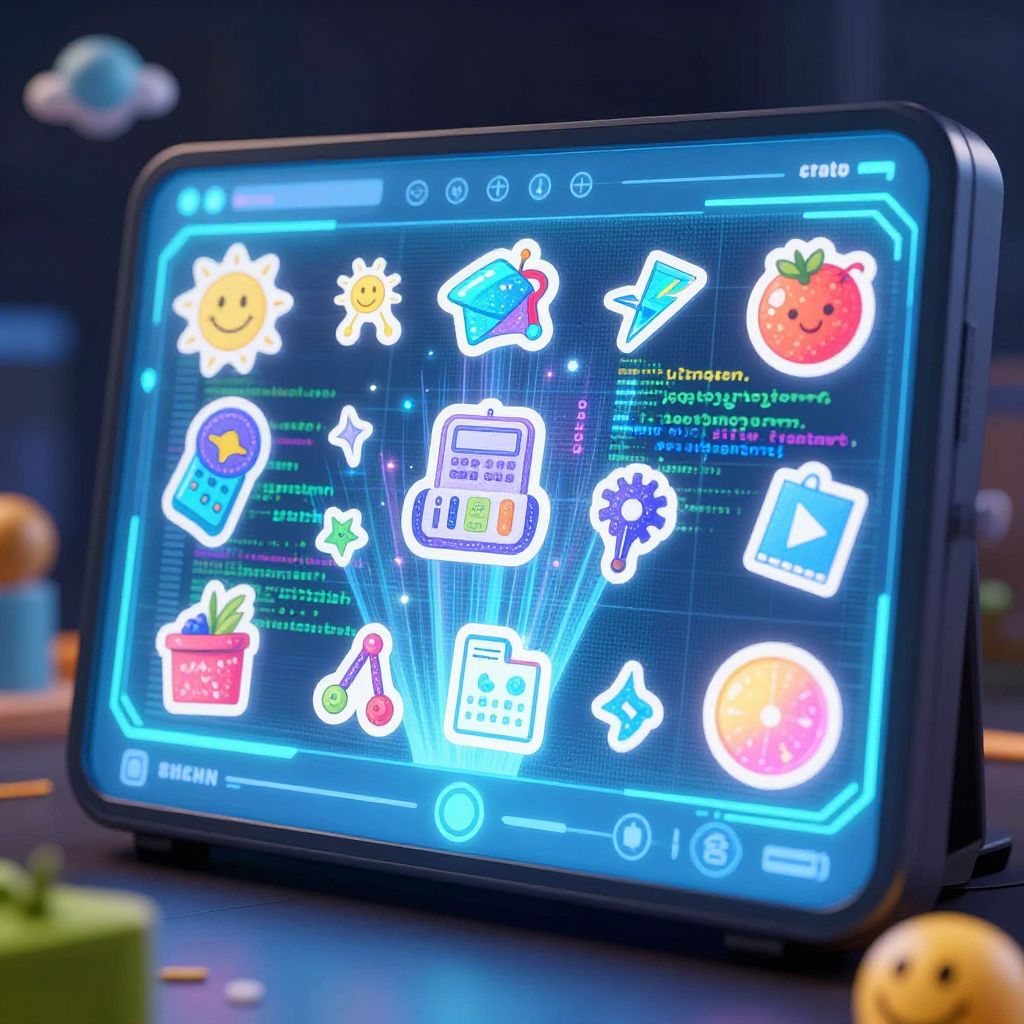 Futuristic sticker generator AI environment, holographic display showing customizable sticker designs with interactive controls, bright colors, creative symbols and shapes emerging from code, high-tech digital art creation scene, immersive and imaginative.