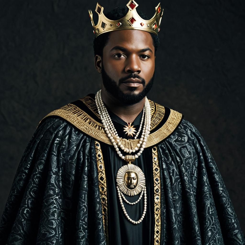 African king costume ,crown, 1boy, solo, male focus, facial hair, beard, jewelry, looking at viewer, necklace, mustache, cape, standing, black hair, robe