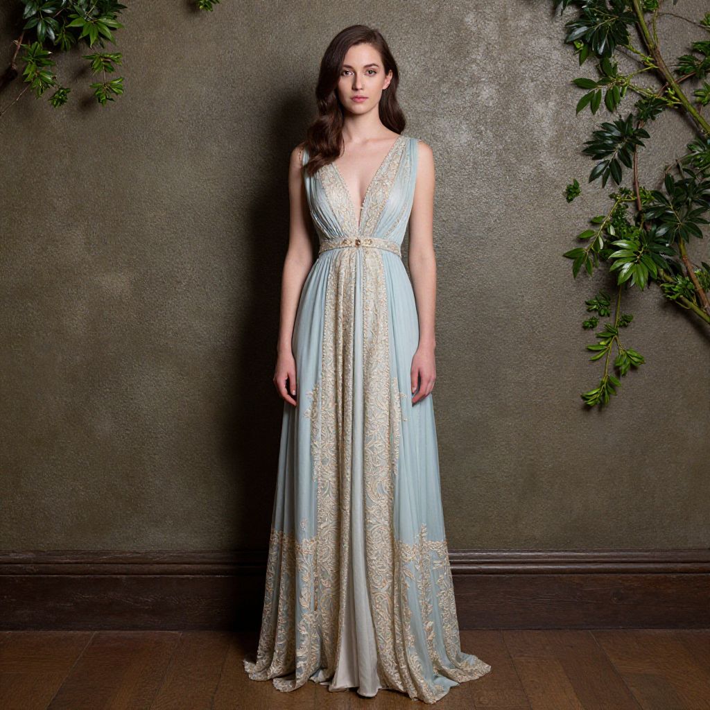 "Secret Garden Official Dress, a woman in a long dress standing in front of a wall"