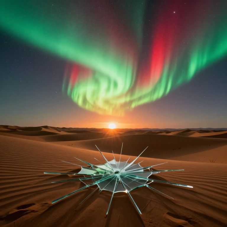Photograph of a shattered ice crystal in a desert at sunset, with vibrant green and red auroras illuminating the night sky.
