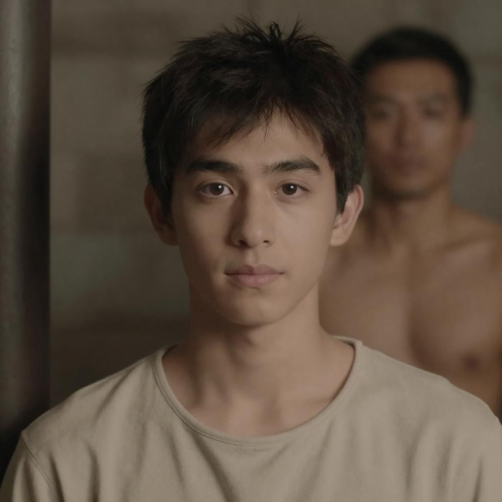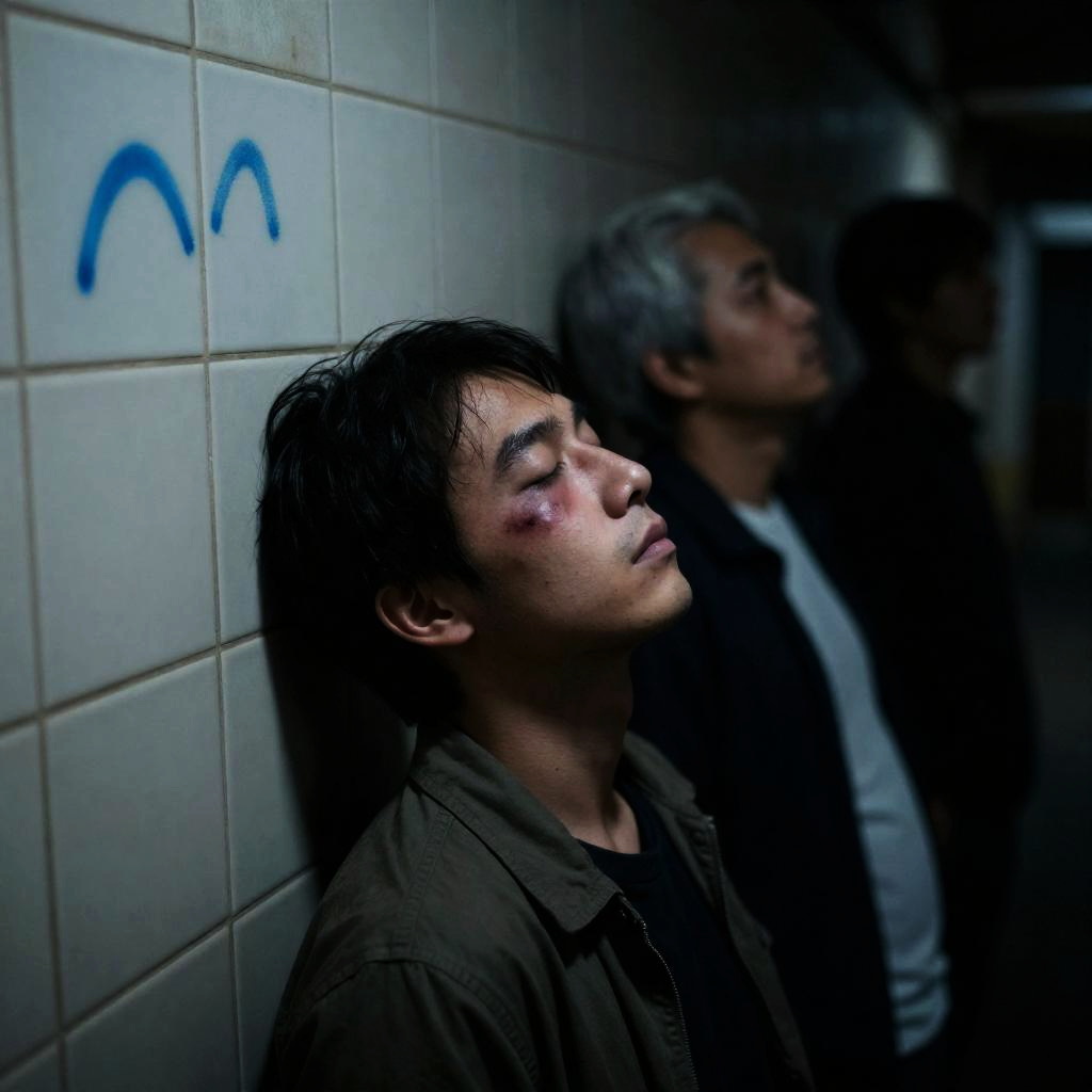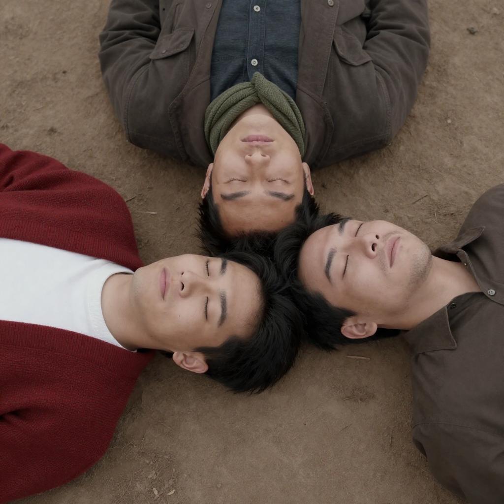 Three Asian men lying on dirt ground, heads touching. Left man in red and white sweater, eyes closed. Center man with dark hair, closed eyes, green scarf, brown jacket. Right man in brown shirt, eyes closed, slight stubble. All men appear calm and relaxed.