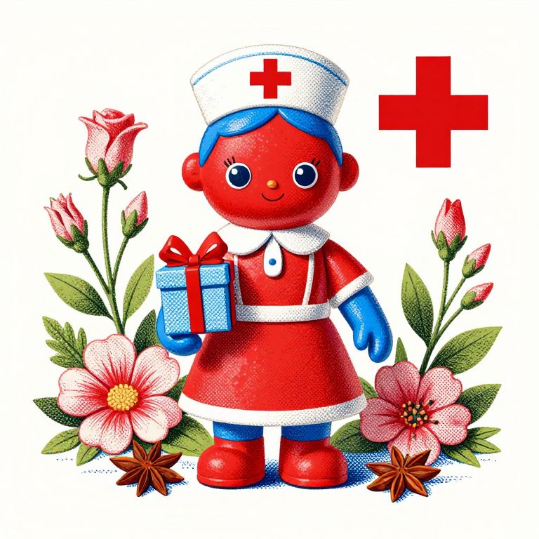 Colorful digital illustration of a red and white cartoon nurse with blue gloves, hat, and boots, holding a blue box, surrounded by flowers, roses