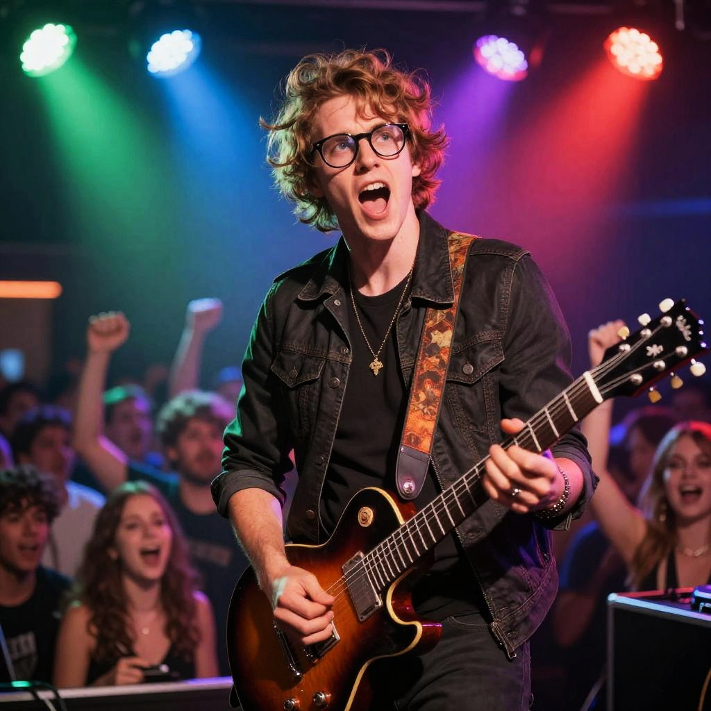 White dude with glasses playing an electric guitar on stage, colorful spotlights, energetic crowd in background, rock concert atmosphere, expressive face, dynamic composition, digital art
