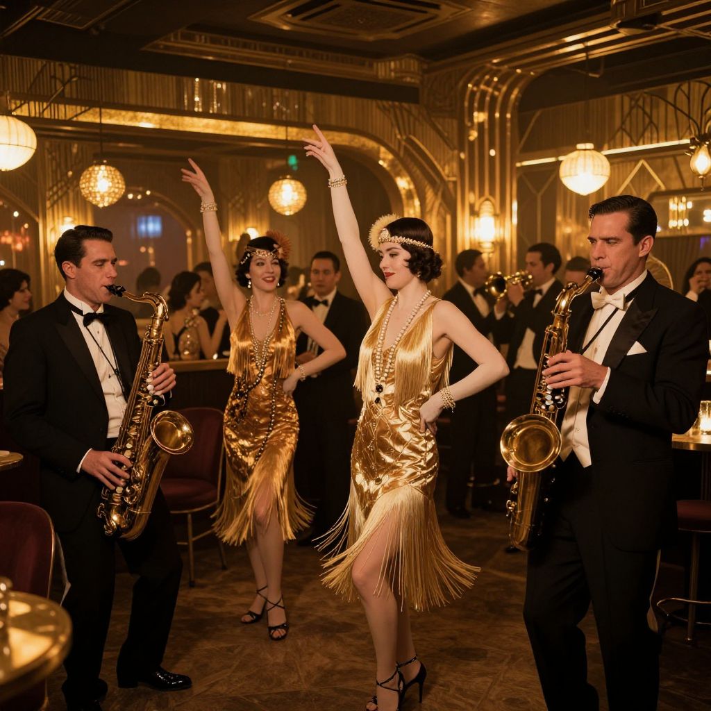 1920's vibrant jazz club scene with flapper dancers in fringed dresses, elegant men in classic tuxedos, saxophones and trumpets playing under warm, golden lights, art deco style decorations and a lively crowd in the background.