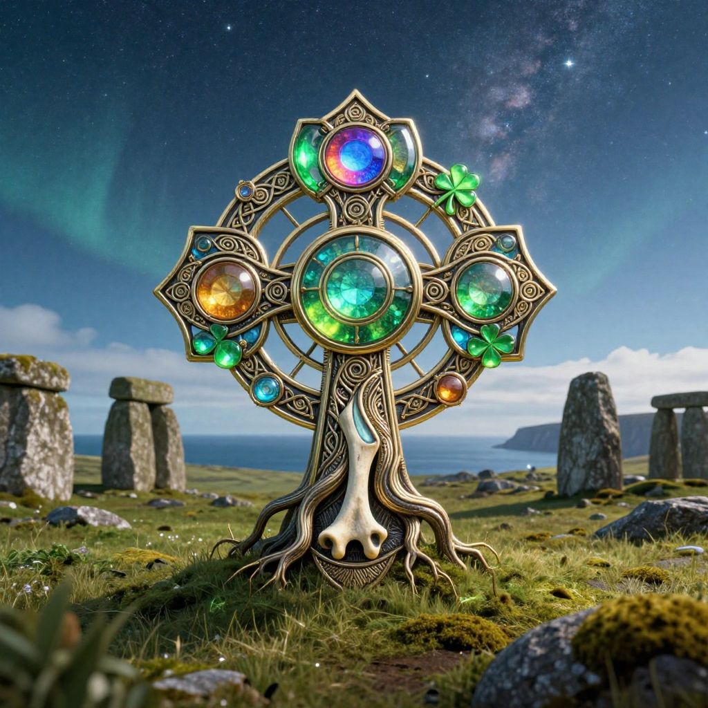 By rella, by makoto shinkai, by_rega, Professional logo photograph, Ancient ornaments excavated, magical artifact, Innovative logo design, (colorful logo, gemstone design style, Antique design style:1.2), (Celtic cross, Celtic stone, Celtic knots, Celtic spiral patterns, Shamrock), [twisting ancient life big tree roots:0.9], Fine engraving, ancient tattoo, amulet, charm, bone, life, supernatural, Irish, heliocentrism, Druidism, Ancient megalithic civilizations, minimalism, modern, elegance, avant-garde, fashionable, futuristic, majestic, aesthetic, abstract, beautiful, vibrant colors and jewels in green, neon green, gold, Antique Gold, Antique Wire, SchalenBlende, halcyon, (gemstone), rainbow color, transparent, ornaments, (metallic:1.5), aging, megastructure, armor, [(details:1.2): [ (many small details:1.3) : [ (many ultrasmall details: 1.2):(very detailed ultrasmall edges and microrelief:1.5):0.7 ]: 0.4 ] :0.2], shiny, sparkling, dimly luminous, realistic lighting, Enhanced Lighting Effects, rays, god rays, soft shadows, LUT, cinematic, film grain, bokeh, Background: Irish landscape, coastline, cliffs, sea, horizon, ancient Celtic forest, moss carpet, clear blue sky, starry sky, space, nebula, aurora, milky way, [flat color:clean color:0.6](amazing quality:1.5), best quality, high quality, 4K, 8K, 16K, UHD, absurdres, highres, intricate, Extremely Detailed, (photorealistic), hyperrealistic, ultrarealistic, logoredmaf, ral-cltc, escher, TNstyle