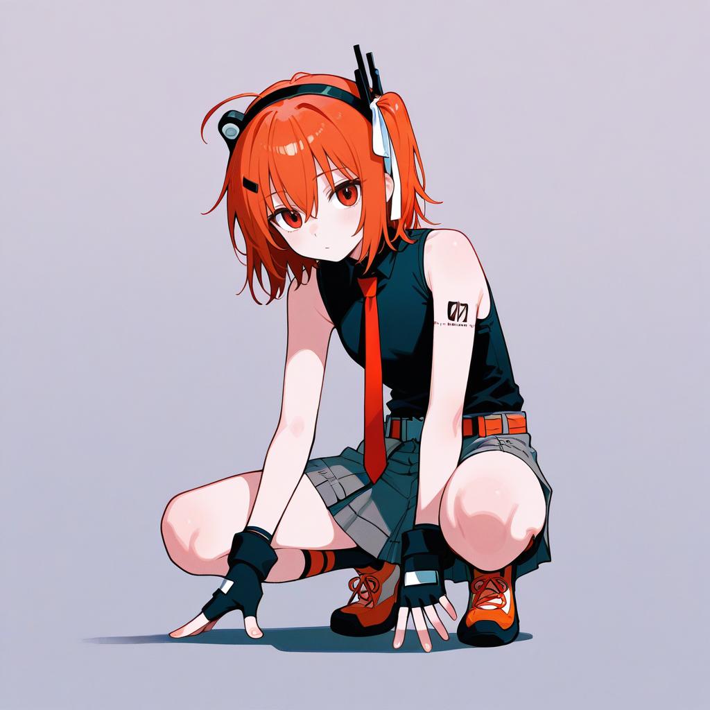 Upper body, adachi rei, red eyes, red hair, sleeveless black shirt, red necktie, short hair, ahoge, tattoo, expressionless, 1girl, soft pastel gradient, on tiptoes about to run, fingerless gloves, solemn calmness