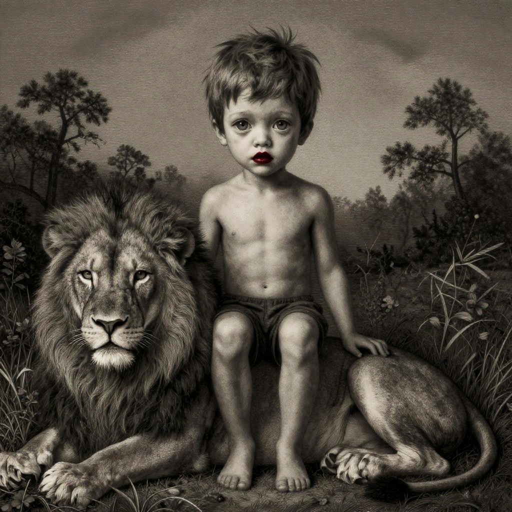 Realistic photo.Fine art etching portrait of a stylized dreamy boy with big sad gray eyes, red lips sitting on a lion, depicted style combination of Bill Carman, Nicoletta Ceccoli, Amy Earles and Abigail Larson, Grimdark, full-length portrait, extremely detailed, beautiful, Best quality, high definition realistic photo