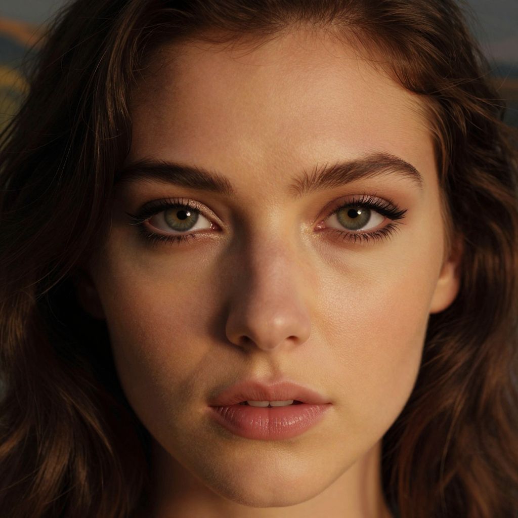 Photograph of a young woman with light skin, green eyes, and wavy brown hair. Her full lips are slightly parted, and she has well-defined eyebrows. The image is a close-up, focusing on her face, which is centered in the frame. The background is blurred, featuring soft, dark hues, suggesting an outdoor setting with natural light. The texture of her skin is smooth, and her eyes are slightly reflective, adding depth to her gaze. The lighting highlights the contours of her face, emphasizing her natural beauty. The overall style is realistic and detailed.