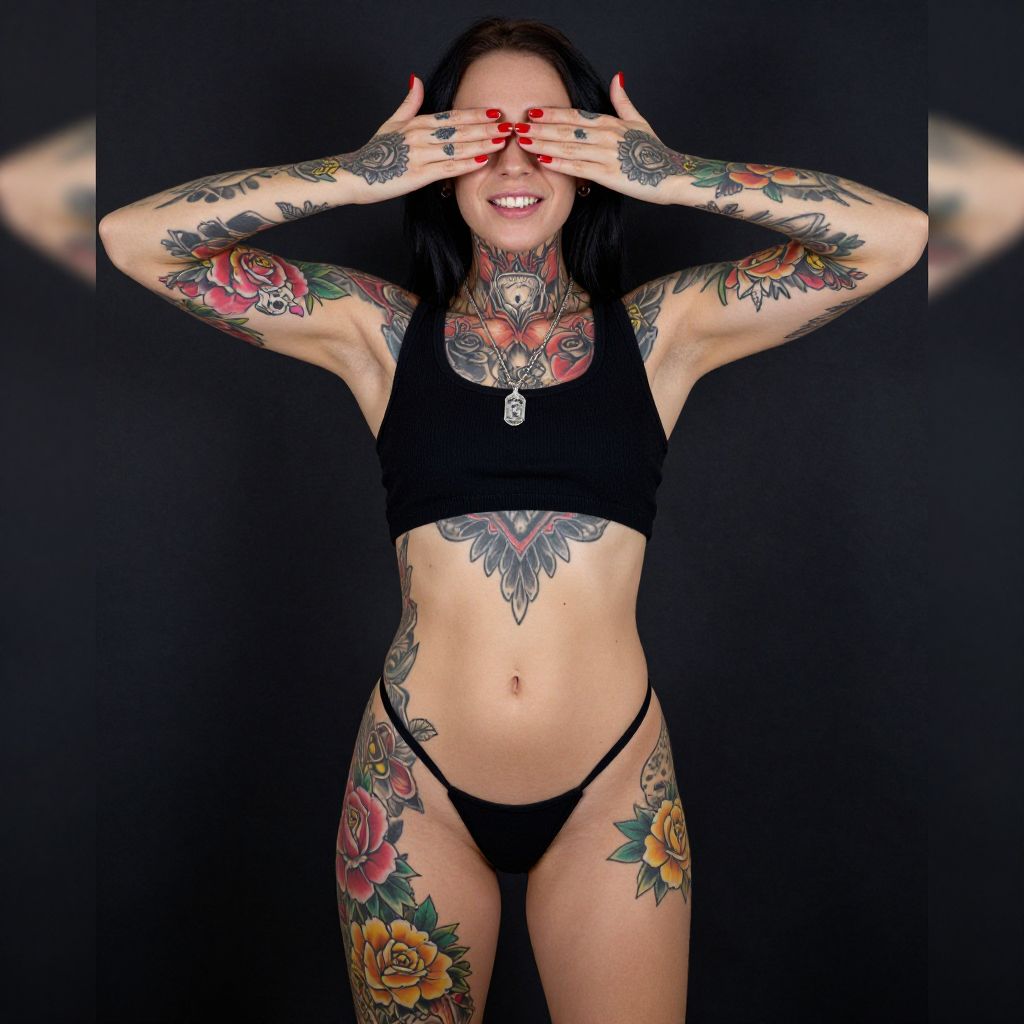 Photograph of a woman with vibrant, full-body tattoos covering her arms, torso, and legs. She's wearing a black crop top and black thong, with her hands covering her eyes in a playful pose. Her tattoos feature colorful roses, skulls, and intricate designs. She has dark hair and a silver necklace with a tag. The background is dark, making her colorful tattoos stand out.