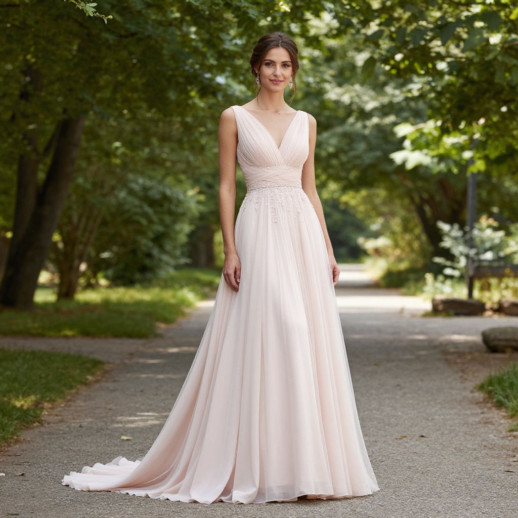 Elegant woman in a flowing pink wedding dress stands gracefully on a paved path, surrounded by lush greenery and soft sunlight filtering through the trees.