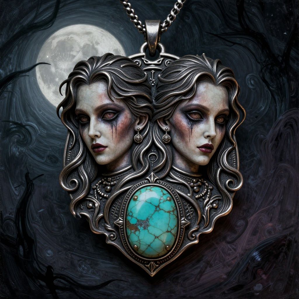 Digital artwork depicting a silver pendant with two intricately carved, wavy-haired female faces, each with pale skin, dark eyes, and subtle pinkish-black smudges on their cheeks. The pendant features a large, oval turquoise stone with black veins at its center. The background is dark with swirling patterns and a bright, full moon in the upper left. The chain is silver and links are visible at the top. The overall style is gothic and fantasy, with a mysterious, ethereal atmosphere.